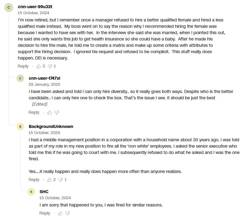 Comments section on cnn.com beneath a story titled, “Two of America’s most prominent Black business leaders have a warning for companies abandoning DEI”